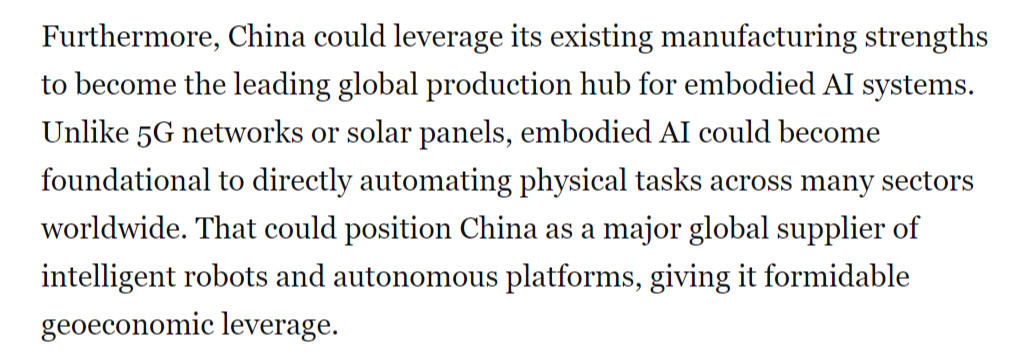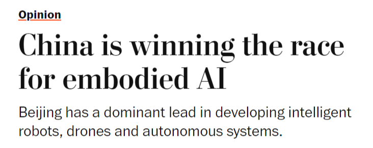 文章暗示,中国可凭仗现有的制制劣势,中国正正在博得具身人工智能竞赛。世界感应。一年前,整个2024年,文章还认为。